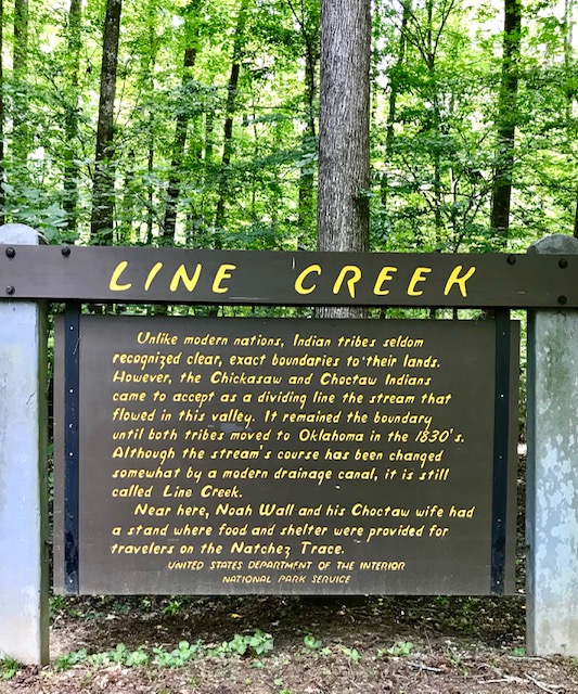 Unlike modern nations, Indian nations seldom recognized clear, exact boundaries to their lands. However, Chickasaw and Choctaw Indians came to accept as a dividing line the stream that flowed in this valley. It remained the boundary until both tribes moved to Oklahoma in the 1830s. Although the stream's course has been changed somewhat by a modern drainage canal, it is still called Line Creek. Near here Noah Wall and his Choctaw wife had a stand where food and shelter were provided.